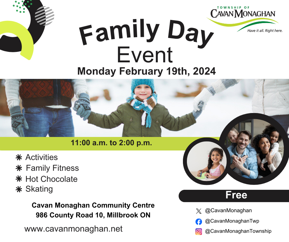 Come join us for a Free Family Day Event. Lots of activities, family fitness, hot chocolate and skating!
